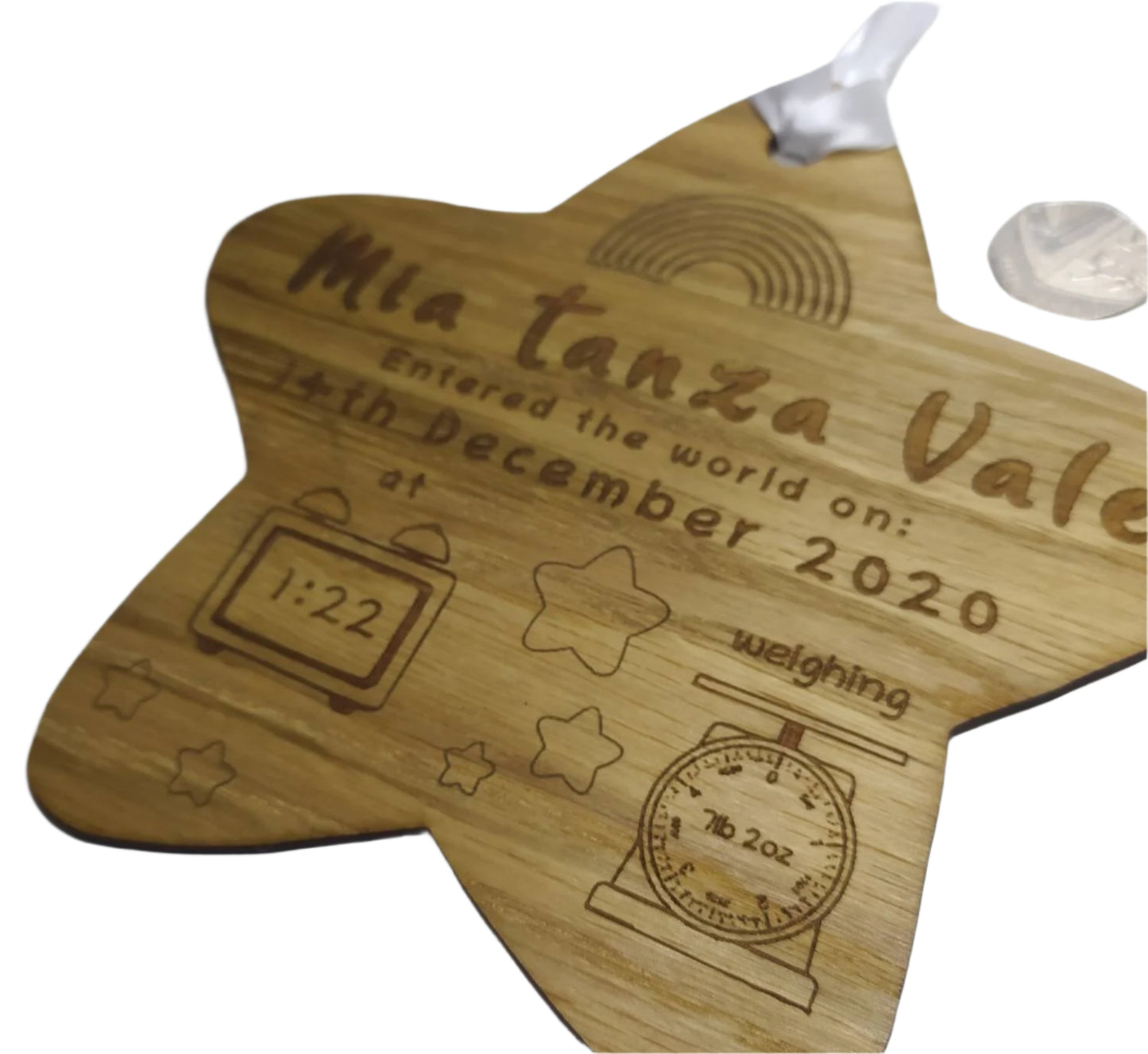 This beautiful 3mm oak veneer wooden star makes the perfect gift for any family welcoming a newborn. Custom engraved with the baby's full name, date of birth, time, and weight, this heartfelt keepsake is a wonderful way to celebrate a new arrival.