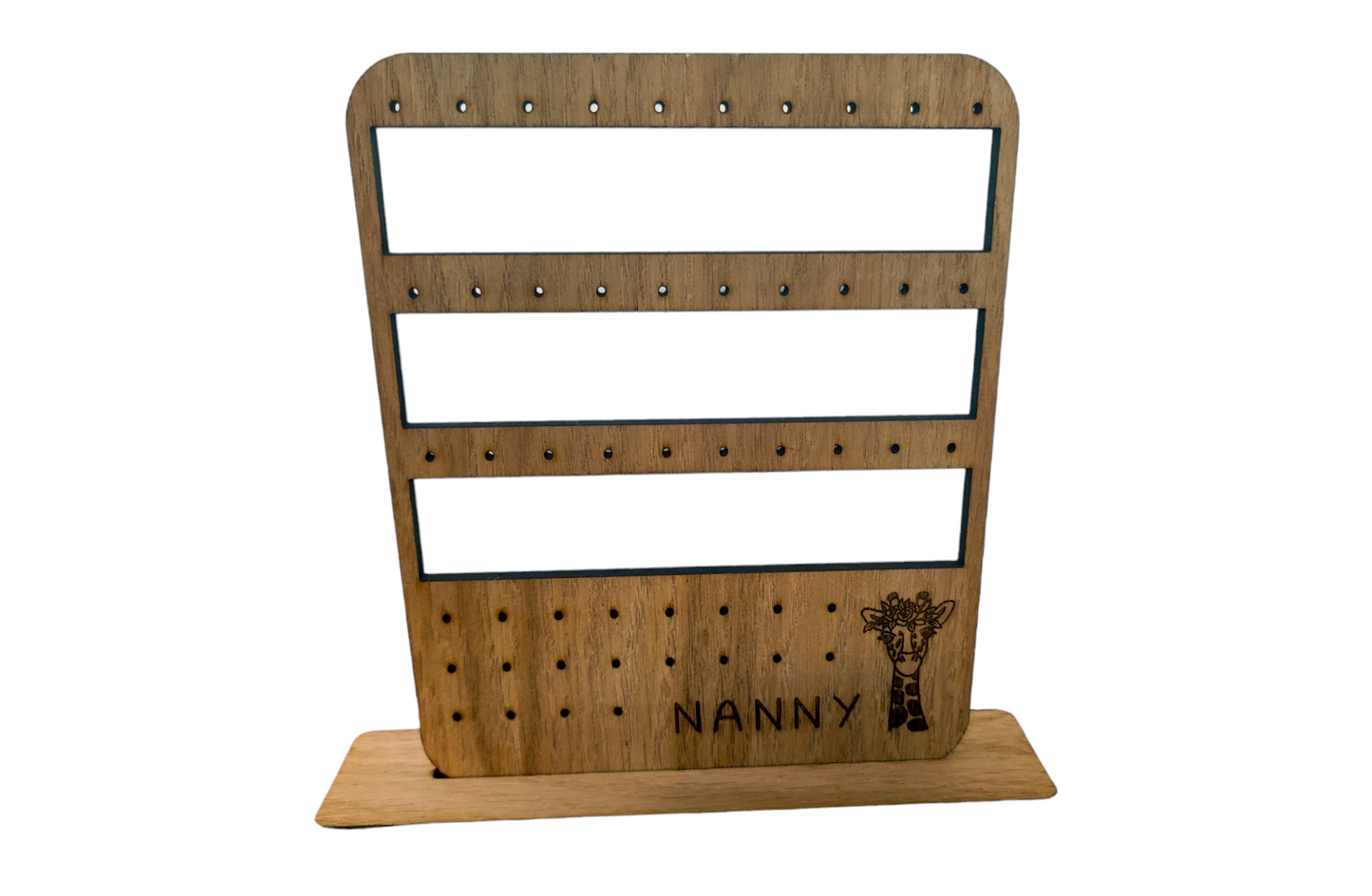 A perfect birthday gift idea for any earring lover, this laser-engraved earring holder is made from high-quality oak veneer wood or acrylic. A stylish and practical jewellery organiser that can be personalised with any name, adding a special touch to any jewellery collection. Ideal for earring displays and perfect for those who love to keep their stud earrings, hoop or hook earrings, and dangles organised.