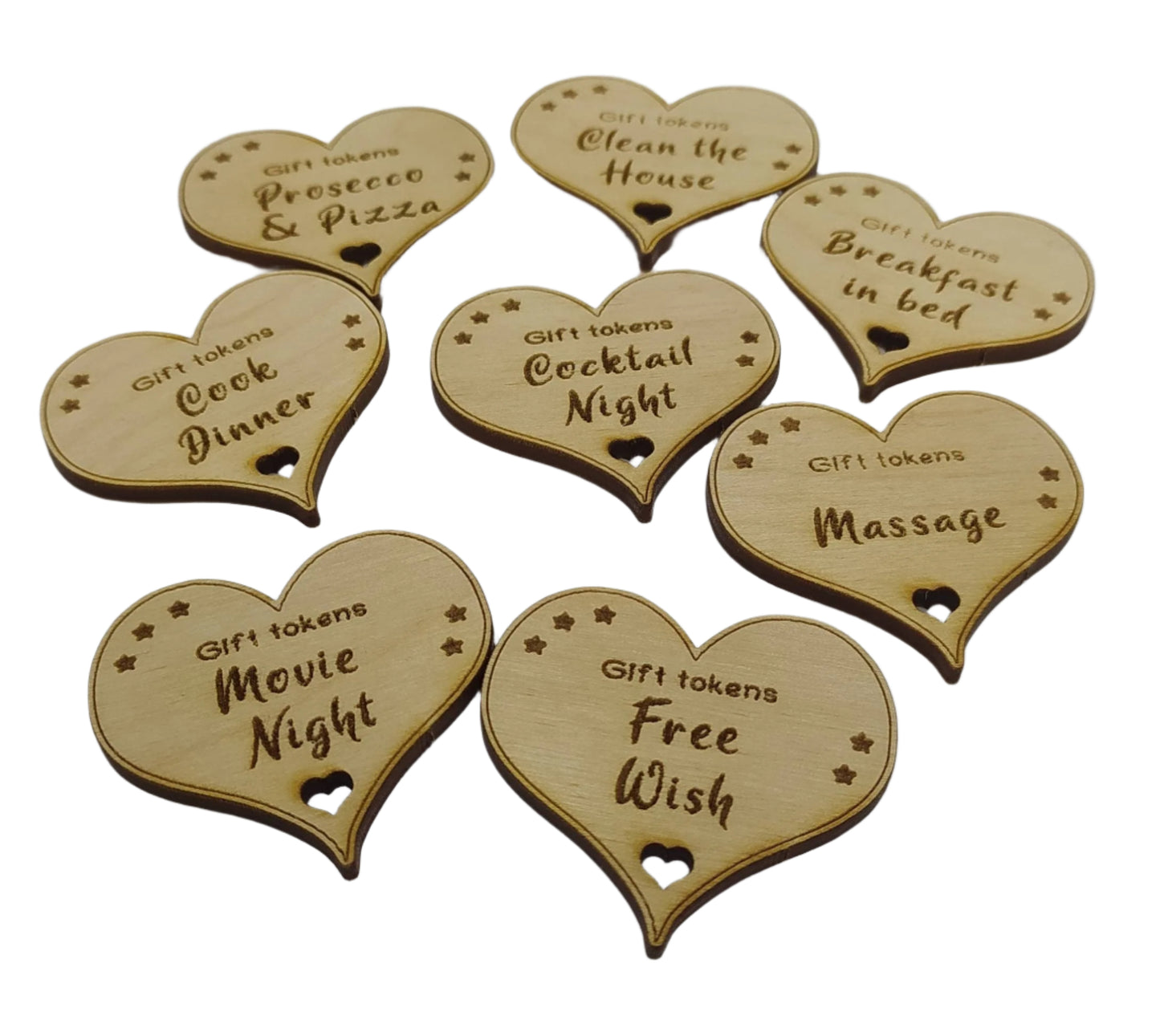 Perfect gift for Valentine's Day or an anniversary, and even better for a 5-year anniversary gift as it is made from wood. These Valentine's Day gifts are beautifully crafted 3mm plywood heart-shaped tokens, laser engraved with different gifts to be given from home—perfect for spending a romantic and meaningful Valentine's Day together.