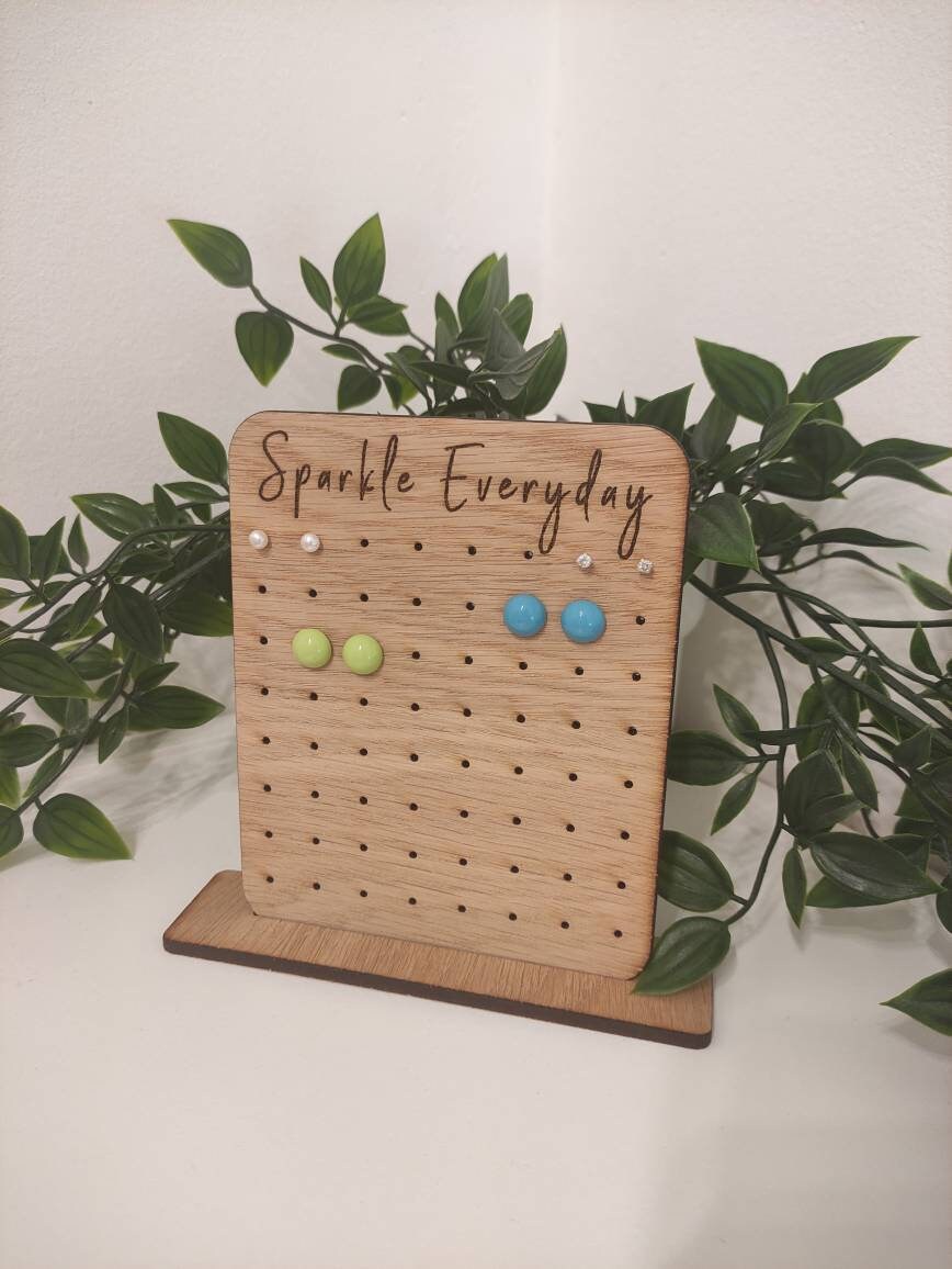 This charming laser-engraved oak veneer earring holder is the perfect gift for anyone looking to add a little sparkle to their everyday routine. Designed to hold up to 32 pairs of stud earrings, the "Sparkle Everyday" engraving adds a touch of inspiration and elegance to this practical and stylish organiser.